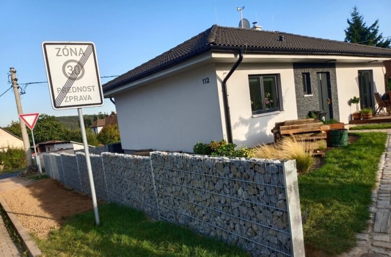 Zámkové dlažby a gabiony jako moderní prvek.